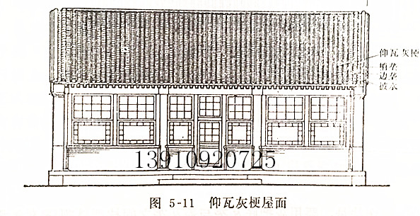 这种屋面在风格上类似筒瓦屋面,但不做盖瓦垄,而在两垄底瓦垄之间用灰堆抹出形似筒瓦垄,宽约4厘米的灰梗。仰瓦灰梗屋面不做复杂的正脊,也不做垂脊,多用于不甚讲究的民宅。