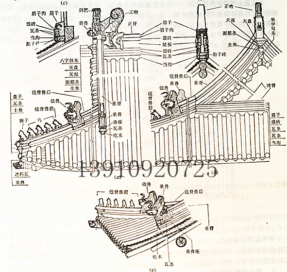 2.圭角、瓦条、盘子等瓦件应与垂脊在同一条直线上,即不用咧角盘子等而要改用直盘子、直圭角等。