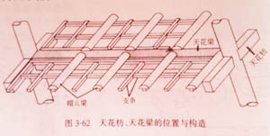 天花枋高6斗口,厚4.8斗口,两端作半榫插入金柱内。天花梁高厚与天花枋相同或稍大,做法一样。帽儿梁间距,一般按两个井格一根,常与支条连做,连做时高4——4.5斗口(单做时2——2.5斗口),厚4斗口。支条高厚2斗口,作成十字井格。