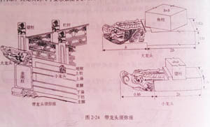 (3)瓜柱:它是指立于下面大梁上用来支承上面梁架的短柱,有的称为“童柱”。在屋脊部位支承脊檩的叫“脊瓜柱或脊童柱”,其他部位叫“瓜柱或金童柱”。但脊瓜柱因其独立较高,其上没有梁架连接,直接支承脊檩,这样其稳定性就差,因此常在柱脚处,辅以稳定的木块称为“角背”。而其他瓜柱因梁架的垂直距离不同而有高低,但当瓜柱高度小于本身横向尺寸时,通常将这种矮瓜柱称为“托墩”,《营造法式》称为“侏儒柱”