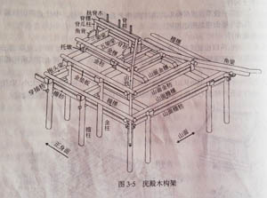 (4)雷公柱:在屋顶正脊部位,对庑殿正身来说,是采用脊瓜柱支承脊檩的,而在山面部位,屋脊要按照“推山法则”的要求,使脊檩推出悬挑一个距离,这时应在脊檩端部下面设置一根支柱,以支承脊檩及其上面的荷重,这所设之柱即为“雷公柱”