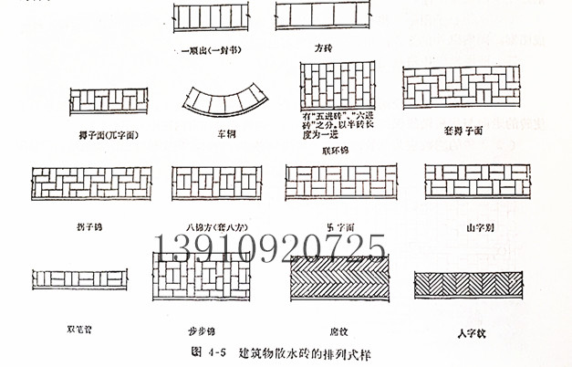 (2)瓦条集锦法 将甬路墁好并裁好散水牙子砖以后,在散水位置上抹一层掺灰泥,然后再磨平了的泥地上按设计要求画出图案,将若干个瓦条依照图案中的线条磨好。如果各别细部不宜用瓦条抹出,可用砖雕刻后代替。然后用油灰将瓦条粘在图案线条的位置上,用瓦条集成图案。瓦条之间的空当摆满石砾,下面也用油灰粘好,最后用生灰面揉擦干净。