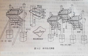 冲天柱式牌楼常用的有:四柱三间三楼和二柱一间一楼等两种。它们的订要构件由下而上有:夹杆石、落地柱、雀替、小额枋、摺柱花板、大额枋、平板枋(二柱一间式可不用)、斗栱、檐楼、大挺钩等。现分述如下: