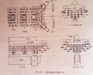 (3)牌楼角科斗栱的坐斗,是采用的“通天斗”,又称为“灯笼榫”,其断面尺寸一般为(3.6*3.6)斗口左右,而斗身应与其下的柱子连在一起,由一根木料做成,向上延伸到正心桁底,实际上成为带有各种卯口的一截短柱。在“通天斗”的迎背面,剔凿有安装正翘、昴、耍头、撑头木等的槽口;在两侧面剔凿有安装正心栱、正心枋、直至正心桁底等的槽口;在四角可剔凿斜翘、斜昴、由昴等后尾留插榫用的卯口;若斜翘昴不留榫者,也可不凿卯口而剔凿成与斜翘昴合缝的平面,以后用铁件连接。
