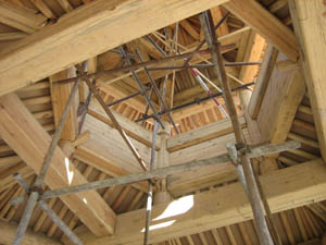 ②滑车、大绳:由于古建筑结构复杂,脚手架绑搭后架子上会有通行不便之处,所以材料提提升,仍需有少量的人力拉运,利用滑车比人力空手提拉轻便。
